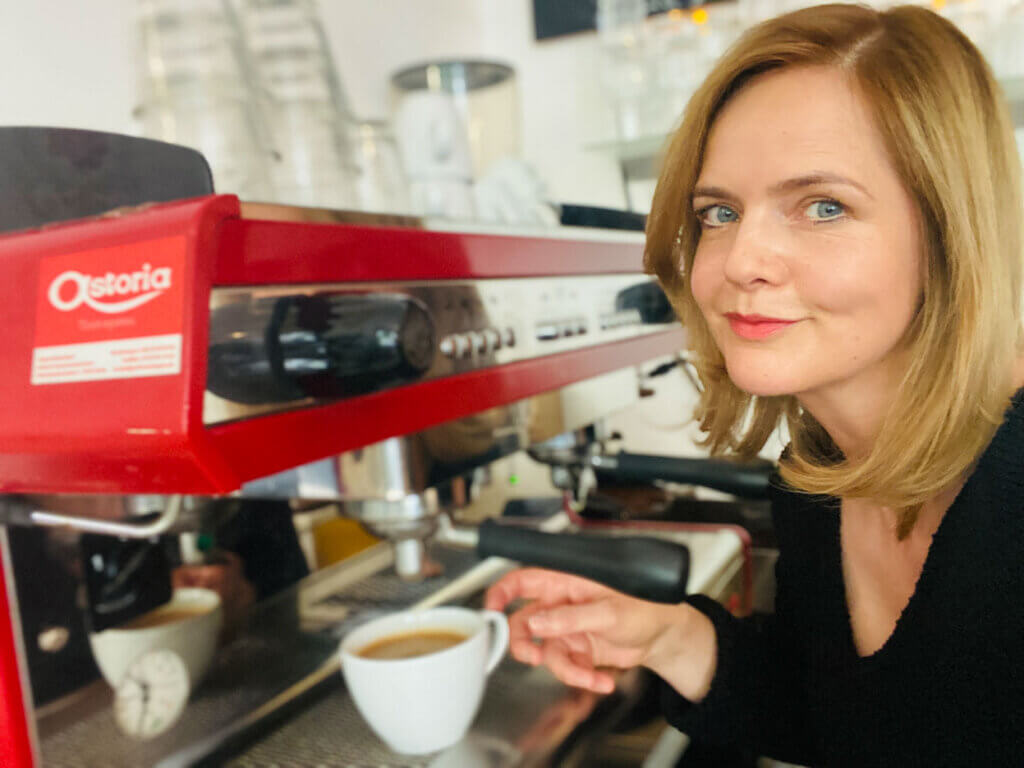 Niiiemals trinke ich Kaffee aus großen Tassen. Wenn mir jemand Kaffee in einem großen Pot anbietet, renne ich schreiend weg. Meine bevorzugte Kaffeetasse: Fassungsvermögen 150 ml und nur in zylindrischer Form. Und niiiemals aus dem Glas. Wenn ich einen Kaffee als „Tante Inge-Kaffee“ bezeichne, ist das ein Kompliment. Ich hatte als Kind eine entfernte Tante namens Inge und wenn die zum Streuselkuchen Filterkaffee brühte, roch die ganze Stube so herrlich nach den Bohnen. Eine meiner liebsten Theaterrollen, die ich gespielt habe, war die Großmutter in „Räuber Hotzenplotz“. Sie schwärmt verständlicherweise für Bohnenkaffee mit Pflaumenkuchen und Schlagsahne. Aber auch Kaffee mit dunkler Schokolade ist für mich ein unschlagbares Duo. Kaffee mit Zigaretten würde ich nicht runterkriegen. Obwohl ich das englische Sprachduo „coffee and cigarettes“ sexy finde und sehr empfänglich dafür bin, wenn es in Songtexten, Buch- oder Filmtiteln auftaucht. Kaffeepackungen sind ja sowas von schweineteuer geworden. Interessant, dass mittlerweile prämierter Rotwein billiger zu haben ist als mieser Kaffee.